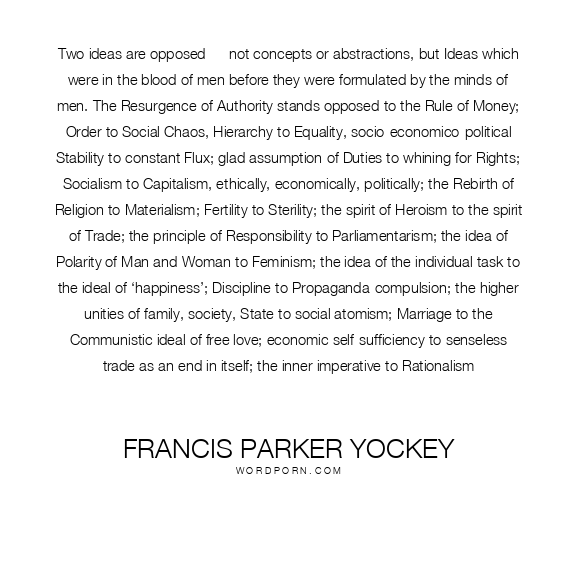 Two ideas are opposed — not concepts or abstractions, but Ideas which were in the blood of men before they were formulated by the minds of men. The Resurgence of Authority stands opposed to the Rule of Money; Order to Social Chaos, Hierarchy to Equality, socio-economico-political Stability to constant Flux; glad assumption of Duties to whining for Rights; Socialism to Capitalism, ethically, economically, politically; the Rebirth of Religion to Materialism; Fertility to Sterility; the spirit of Heroism to the spirit of Trade; the principle of Responsibility to Parliamentarism; the idea of Polarity of Man and Woman to Feminism; the idea of the individual task to the ideal of ‘happiness’; Discipline to Propaganda-compulsion; the higher unities of family, society, State to social atomism; Marriage to the Communistic ideal of free love; economic self-sufficiency to senseless trade as an end in itself; the inner imperative to Rationalism