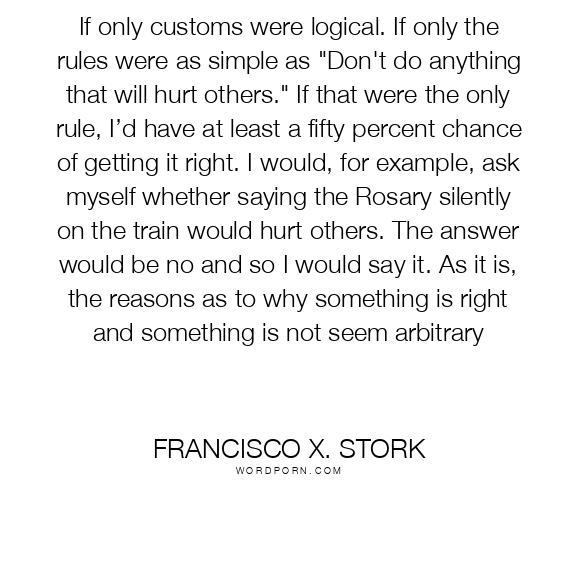 If only customs were logical. If only the rules were as simple as "Don't do anything that will hurt others." If that were the only rule, I’d have at least a fifty percent chance of getting it right. I would, for example, ask myself whether saying the Rosary silently on the train would hurt others. The answer would be no and so I would say it. As it is, the reasons as to why something is right and something is not seem arbitrary