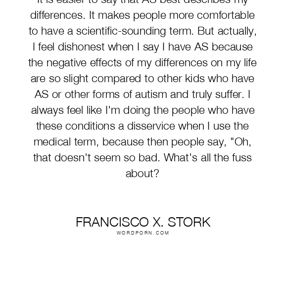 It is easier to say that AS best describes my differences. It makes people more comfortable to have a scientific-sounding term. But actually, I feel dishonest when I say I have AS because the negative effects of my differences on my life are so slight compared to other kids who have AS or other forms of autism and truly suffer. I always feel like I'm doing the people who have these conditions a disservice when I use the medical term, because then people say, "Oh, that doesn't seem so bad. What's all the fuss about?