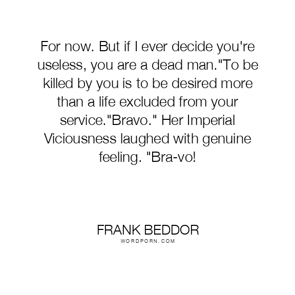 For now. But if I ever decide you're useless, you are a dead man."To be killed by you is to be desired more than a life excluded from your service."Bravo." Her Imperial Viciousness laughed with genuine feeling. "Bra-vo!