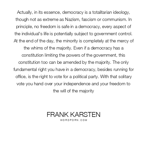 Actually, in its essence, democracy is a totalitarian ideology, though not as extreme as Nazism, fascism or communism. In principle, no freedom is safe in a democracy, every aspect of the individual's life is potentially subject to government control. At the end of the day, the minority is completely at the mercy of the whims of the majority. Even if a democracy has a constitution limiting the powers of the government, this constitution too can be amended by the majority. The only fundamental right you have in a democracy, besides running for office, is the right to vote for a political party. With that solitary vote you hand over your independence and your freedom to the will of the majority