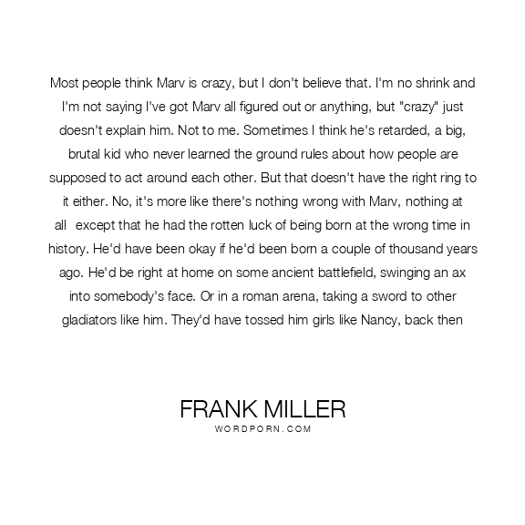 Most people think Marv is crazy, but I don't believe that. I'm no shrink and I'm not saying I've got Marv all figured out or anything, but "crazy" just doesn't explain him. Not to me. Sometimes I think he's retarded, a big, brutal kid who never learned the ground rules about how people are supposed to act around each other. But that doesn't have the right ring to it either. No, it's more like there's nothing wrong with Marv, nothing at all--except that he had the rotten luck of being born at the wrong time in history. He'd have been okay if he'd been born a couple of thousand years ago. He'd be right at home on some ancient battlefield, swinging an ax into somebody's face. Or in a roman arena, taking a sword to other gladiators like him. They'd have tossed him girls like Nancy, back then