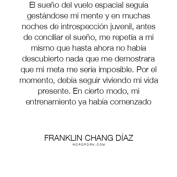 El sueño del vuelo espacial seguía gestándose mi mente y en muchas noches de introspección juvenil, antes de conciliar el sueño, me repetía a mí mismo que hasta ahora no había descubierto nada que me demostrara que mi meta me sería imposible. Por el momento, debía seguir viviendo mi vida presente. En cierto modo, mi entrenamiento ya había comenzado