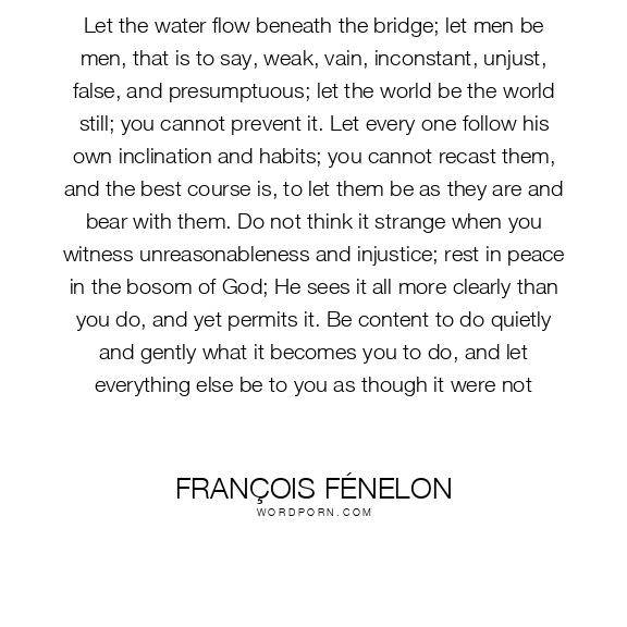 Let the water flow beneath the bridge; let men be men, that is to say, weak, vain, inconstant, unjust, false, and presumptuous; let the world be the world still; you cannot prevent it. Let every one follow his own inclination and habits; you cannot recast them, and the best course is, to let them be as they are and bear with them. Do not think it strange when you witness unreasonableness and injustice; rest in peace in the bosom of God; He sees it all more clearly than you do, and yet permits it. Be content to do quietly and gently what it becomes you to do, and let everything else be to you as though it were not