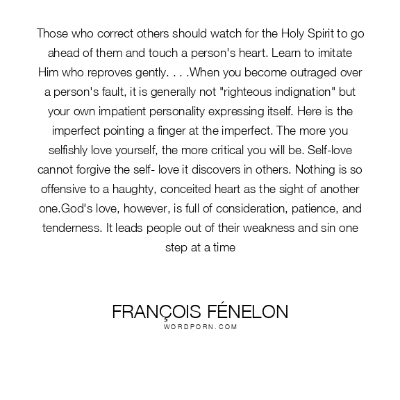 Those who correct others should watch for the Holy Spirit to go ahead of them and touch a person's heart. Learn to imitate Him who reproves gently. . . .When you become outraged over a person's fault, it is generally not "righteous indignation" but your own impatient personality expressing itself. Here is the imperfect pointing a finger at the imperfect. The more you selfishly love yourself, the more critical you will be. Self-love cannot forgive the self- love it discovers in others. Nothing is so offensive to a haughty, conceited heart as the sight of another one.God's love, however, is full of consideration, patience, and tenderness. It leads people out of their weakness and sin one step at a time