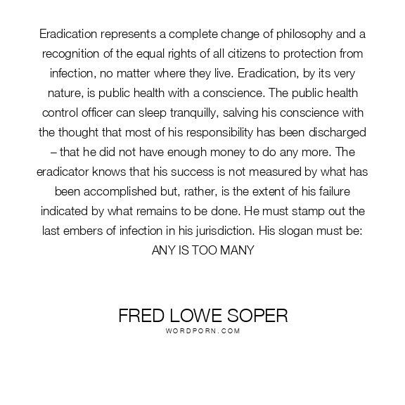 Eradication represents a complete change of philosophy and a recognition of the equal rights of all citizens to protection from infection, no matter where they live. Eradication, by its very nature, is public health with a conscience. The public health control officer can sleep tranquilly, salving his conscience with the thought that most of his responsibility has been discharged – that he did not have enough money to do any more. The eradicator knows that his success is not measured by what has been accomplished but, rather, is the extent of his failure indicated by what remains to be done. He must stamp out the last embers of infection in his jurisdiction. His slogan must be: ANY IS TOO MANY