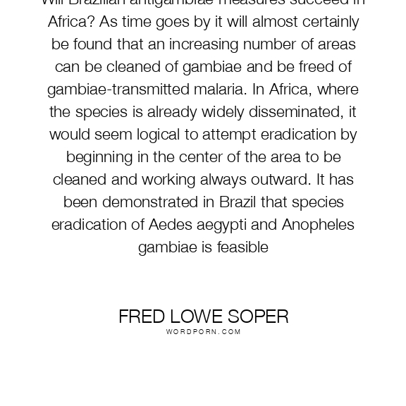 Will Brazilian antigambiae measures succeed in Africa? As time goes by it will almost certainly be found that an increasing number of areas can be cleaned of gambiae and be freed of gambiae-transmitted malaria. In Africa, where the species is already widely disseminated, it would seem logical to attempt eradication by beginning in the center of the area to be cleaned and working always outward. It has been demonstrated in Brazil that species eradication of Aedes aegypti and Anopheles gambiae is feasible