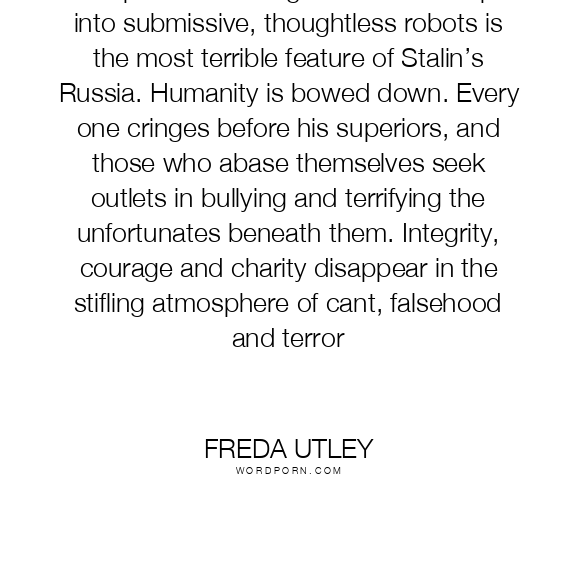 Perhaps the breaking of the human spirit into submissive, thoughtless robots is the most terrible feature of Stalin’s Russia. Humanity is bowed down. Every one cringes before his superiors, and those who abase themselves seek outlets in bullying and terrifying the unfortunates beneath them. Integrity, courage and charity disappear in the stifling atmosphere of cant, falsehood and terror