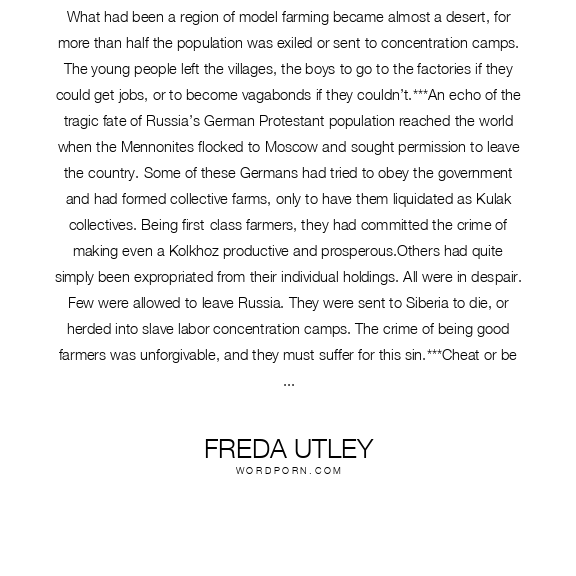 What had been a region of model farming became almost a desert, for more than half the population was exiled or sent to concentration camps. The young people left the villages, the boys to go to the factories if they could get jobs, or to become vagabonds if they couldn’t.***An echo of the tragic fate of Russia’s German Protestant population reached the world when the Mennonites flocked to Moscow and sought permission to leave the country. Some of these Germans had tried to obey the government and had formed collective farms, only to have them liquidated as Kulak collectives. Being first-class farmers, they had committed the crime of making even a Kolkhoz productive and prosperous.Others had quite simply been expropriated from their individual holdings. All were in despair. Few were allowed to leave Russia. They were sent to Siberia to die, or herded into slave labor concentration camps. The crime of being good farmers was unforgivable, and they must suffer for this sin.***Cheat or be cheated, bully or be bullied, was the law of life. Only the German minority with their strong religious and moral sense—the individual morality of the Protestant as opposed to the mass subservience demanded by the Greek Orthodox Church and the Soviet Government—retained their culture and even some courage under Stalin’s Terror