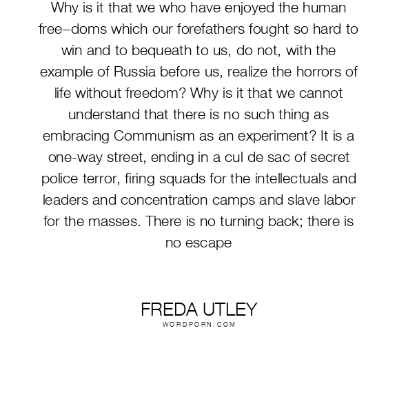 Why is it that we who have enjoyed the human freedoms which our forefathers fought so hard to win and to bequeath to us, do not, with the example of Russia before us, realize the horrors of life without freedom? Why is it that we cannot understand that there is no such thing as embracing Communism as an experiment? It is a one-way street, ending in a cul de sac of secret police terror, firing squads for the intellectuals and leaders and concentration camps and slave labor for the masses. There is no turning back; there is no escape