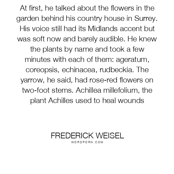 At first, he talked about the flowers in the garden behind his country house in Surrey. His voice still had its Midlands accent but was soft now and barely audible. He knew the plants by name and took a few minutes with each of them: ageratum, coreopsis, echinacea, rudbeckia. The yarrow, he said, had rose-red flowers on two-foot stems. Achillea millefolium, the plant Achilles used to heal wounds