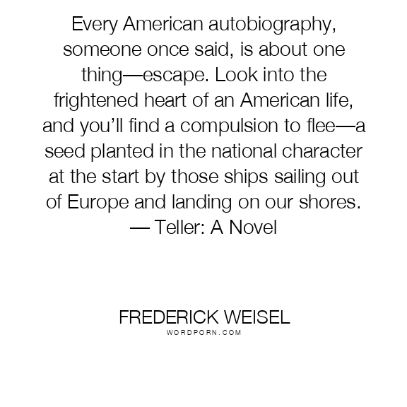 Every American autobiography, someone once said, is about one thing—escape. Look into the frightened heart of an American life, and you’ll find a compulsion to flee—a seed planted in the national character at the start by those ships sailing out of Europe and landing on our shores. — Teller: A Novel