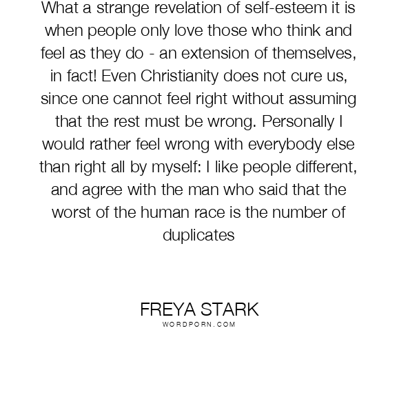 What a strange revelation of self-esteem it is when people only love those who think and feel as they do - an extension of themselves, in fact! Even Christianity does not cure us, since one cannot feel right without assuming that the rest must be wrong. Personally I would rather feel wrong with everybody else than right all by myself: I like people different, and agree with the man who said that the worst of the human race is the number of duplicates