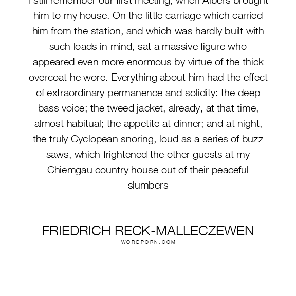 I still remember our first meeting, when Albers brought him to my house. On the little carriage which carried him from the station, and which was hardly built with such loads in mind, sat a massive figure who appeared even more enormous by virtue of the thick overcoat he wore. Everything about him had the effect of extraordinary permanence and solidity: the deep bass voice; the tweed jacket, already, at that time, almost habitual; the appetite at dinner; and at night, the truly Cyclopean snoring, loud as a series of buzz saws, which frightened the other guests at my Chiemgau country house out of their peaceful slumbers
