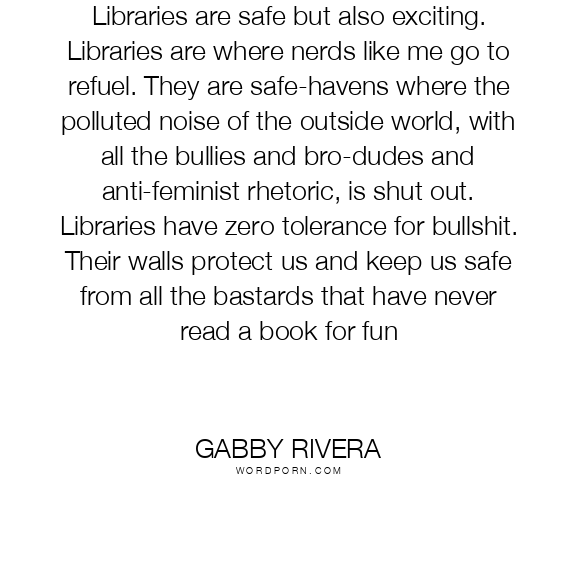Libraries are safe but also exciting. Libraries are where nerds like me go to refuel. They are safe-havens where the polluted noise of the outside world, with all the bullies and bro-dudes and anti-feminist rhetoric, is shut out. Libraries have zero tolerance for bullshit. Their walls protect us and keep us safe from all the bastards that have never read a book for fun