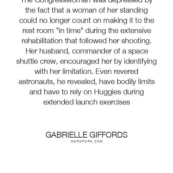 The Congresswoman was depressed by the fact that a woman of her standing could no longer count on making it to the rest room "in time" during the extensive rehabilitation that followed her shooting. Her husband, commander of a space shuttle crew, encouraged her by identifying with her limitation. Even revered astronauts, he revealed, have bodily limits and have to rely on Huggies during extended launch exercises
