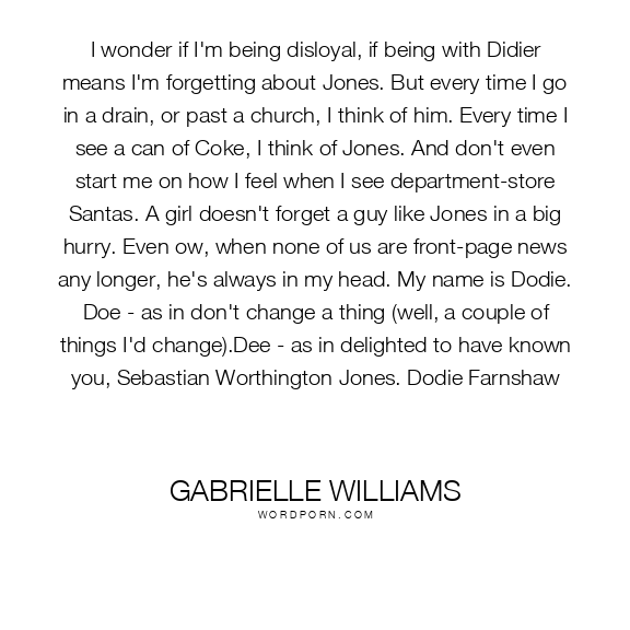 I wonder if I'm being disloyal, if being with Didier means I'm forgetting about Jones. But every time I go in a drain, or past a church, I think of him. Every time I see a can of Coke, I think of Jones. And don't even start me on how I feel when I see department-store Santas. A girl doesn't forget a guy like Jones in a big hurry. Even ow, when none of us are front-page news any longer, he's always in my head. My name is Dodie. Doe - as in don't change a thing (well, a couple of things I'd change).Dee - as in delighted to have known you, Sebastian Worthington Jones. Dodie Farnshaw