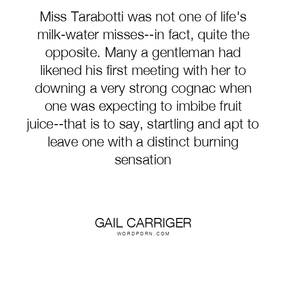 Miss Tarabotti was not one of life's milk-water misses--in fact, quite the opposite. Many a gentleman had likened his first meeting with her to downing a very strong cognac when one was expecting to imbibe fruit juice--that is to say, startling and apt to leave one with a distinct burning sensation