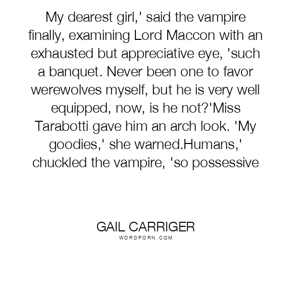 My dearest girl,' said the vampire finally, examining Lord Maccon with an exhausted but appreciative eye, 'such a banquet. Never been one to favor werewolves myself, but he is very well equipped, now, is he not?'Miss Tarabotti gave him an arch look. 'My goodies,' she warned.Humans,' chuckled the vampire, 'so possessive