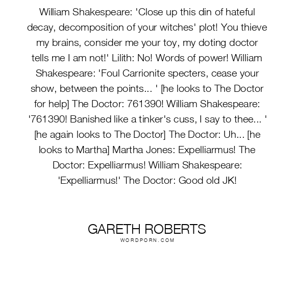 William Shakespeare: 'Close up this din of hateful decay, decomposition of your witches' plot! You thieve my brains, consider me your toy, my doting doctor tells me I am not!' Lilith: No! Words of power! William Shakespeare: 'Foul Carrionite specters, cease your show, between the points... ' [he looks to The Doctor for help] The Doctor: 761390! William Shakespeare: '761390! Banished like a tinker's cuss, I say to thee... ' [he again looks to The Doctor] The Doctor: Uh... [he looks to Martha] Martha Jones: Expelliarmus! The Doctor: Expelliarmus! William Shakespeare: 'Expelliarmus!' The Doctor: Good old JK!