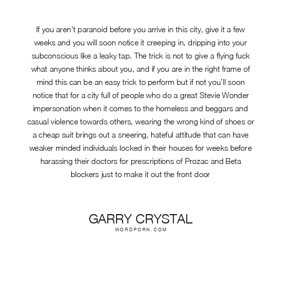 If you aren’t paranoid before you arrive in this city, give it a few weeks and you will soon notice it creeping in, dripping into your subconscious like a leaky tap. The trick is not to give a flying fuck what anyone thinks about you, and if you are in the right frame of mind this can be an easy trick to perform but if not you’ll soon notice that for a city full of people who do a great Stevie Wonder impersonation when it comes to the homeless and beggars and casual violence towards others, wearing the wrong kind of shoes or a cheap suit brings out a sneering, hateful attitude that can have weaker minded individuals locked in their houses for weeks before harassing their doctors for prescriptions of Prozac and Beta blockers just to make it out the front door
