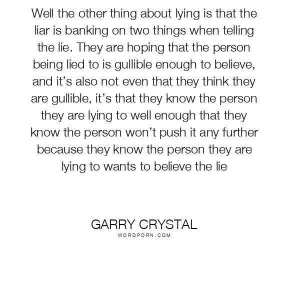 Well the other thing about lying is that the liar is banking on two things when telling the lie. They are hoping that the person being lied to is gullible enough to believe, and it’s also not even that they think they are gullible, it’s that they know the person they are lying to well enough that they know the person won’t push it any further because they know the person they are lying to wants to believe the lie