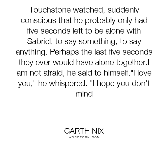 Touchstone watched, suddenly conscious that he probably only had five seconds left to be alone with Sabriel, to say something, to say anything. Perhaps the last five seconds they ever would have alone together.I am not afraid, he said to himself."I love you," he whispered. "I hope you don't mind