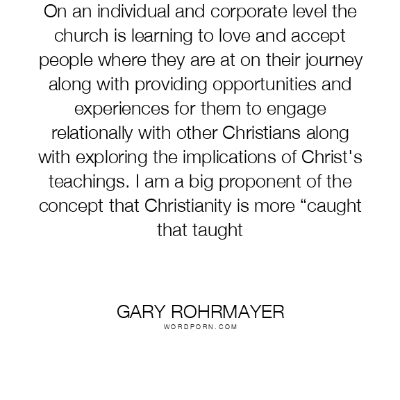 On an individual and corporate level the church is learning to love and accept people where they are at on their journey along with providing opportunities and experiences for them to engage relationally with other Christians along with exploring the implications of Christ's teachings. I am a big proponent of the concept that Christianity is more “caught that taught