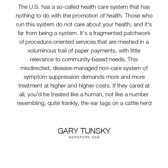 The U.S. has a so-called health care system that has nothing to do with the promotion of health. Those who run this system do not care about your health, and it's far from being a system. It's a fragmented patchwork of procedure-oriented services that are meshed in a voluminous trail of paper payments, with little relevance to community-based needs. This misdirected, disease-managed non-care system of symptom suppression demands more and more treatment at higher and higher costs. If they cared at all, you'd be treated like a human, not like a number resembling, quite frankly, the ear tags on a cattle herd