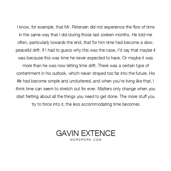 I know, for example, that Mr. Petersen did not experience the flow of time in the same way that I did during those last sixteen months. He told me often, particularly towards the end, that for him time had become a slow, peaceful drift. If I had to guess why this was the case, I'd say that maybe it was because this was time he never expected to have. Or maybe it was more than he was now letting time drift. There was a certain type of contentment in his outlook, which never strayed too far into the future. His life had become simple and uncluttered, and when you're living like that, I think time can seem to stretch out for ever. Matters only change when you start fretting about all the things you need to get done. The more stuff you try to force into it, the less accommodating time becomes