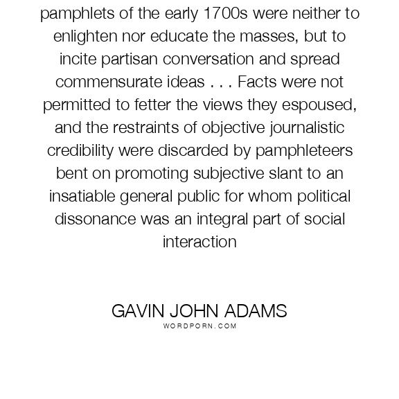 The primary purposes of the political pamphlets of the early 1700s were neither to enlighten nor educate the masses, but to incite partisan conversation and spread commensurate ideas . . . Facts were not permitted to fetter the views they espoused, and the restraints of objective journalistic credibility were discarded by pamphleteers bent on promoting subjective slant to an insatiable general public for whom political dissonance was an integral part of social interaction