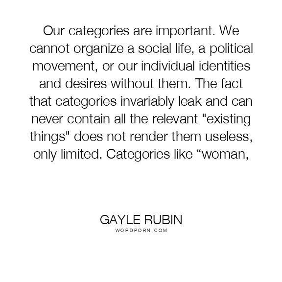 Our categories are important. We cannot organize a social life, a political movement, or our individual identities and desires without them. The fact that categories invariably leak and can never contain all the relevant "existing things" does not render them useless, only limited. Categories like “woman,