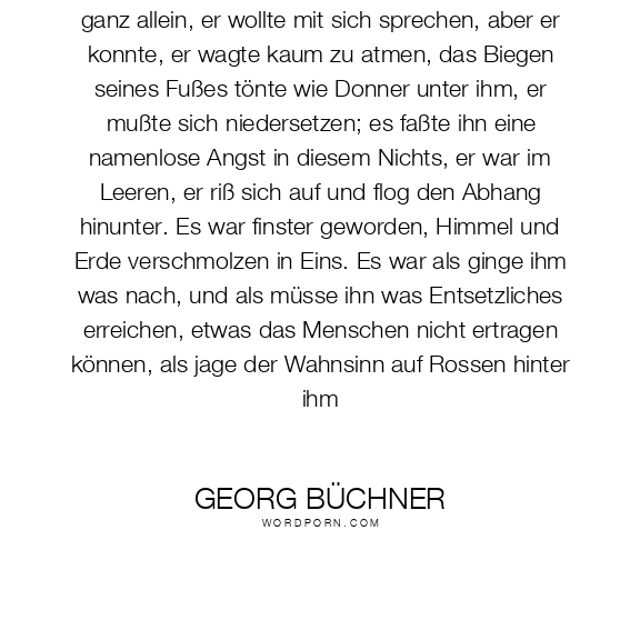 Es wurde ihm entsetzlich einsam, er war allein, ganz allein, er wollte mit sich sprechen, aber er konnte, er wagte kaum zu atmen, das Biegen seines Fußes tönte wie Donner unter ihm, er mußte sich niedersetzen; es faßte ihn eine namenlose Angst in diesem Nichts, er war im Leeren, er riß sich auf und flog den Abhang hinunter. Es war finster geworden, Himmel und Erde verschmolzen in Eins. Es war als ginge ihm was nach, und als müsse ihn was Entsetzliches erreichen, etwas das Menschen nicht ertragen können, als jage der Wahnsinn auf Rossen hinter ihm