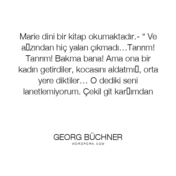 Marie- Günler uzun, dünya yaşlı olduğuna göre, birinin durduğu yerde pek çok insan durabilir, birbiriarkasından.Woyzeck- Gördüm tamam mı! Gördüm diyorum sana!Marie- İnsanın iki gözü olup kör de değilse, pek çok şey görür güneş parladıkça.Woyzeck- Bu kadar büyük bir günah, gökteki melekleri bile kaçırtır günahının kokusu! Dudakların ne kadar kırmızı, Marie! Hiç yara yokmu üstünde? Günah kadar güzelsin. Marie,senin kadar güzel olabilirmi en korkunç günah?Marie- Neyin var senin delirdin mi?Woyzeck- Üşüyorsundur belki Marie? Ama nedense pek sıcaksın. Ne sıcak dudakların var. Üşüyor musun? İnsan soğudumu bir kez hiç üşümez artık.Marie- Dokunma bana Franz! (Diyerek iter.)Woyzeck- Sıcacık soluğun, sıcacık oruspu soluğu! Ama yine de dünyaları verirdim o dudakları bir dahaöpmek için.Marie- Elin değeceğine elime, göğsüme bıçak saplansın daha iyi.Woyzeck- Orospu!