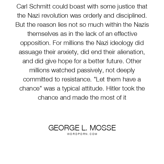 Carl Schmitt could boast with some justice that the Nazi revolution was orderly and disciplined. But the reason lies not so much within the Nazis themselves as in the lack of an effective opposition. For millions the Nazi ideology did assuage their anxiety, did end their alienation, and did give hope for a better future. Other millions watched passively, not deeply committed to resistance. "Let them have a chance" was a typical attitude. Hitler took the chance and made the most of it