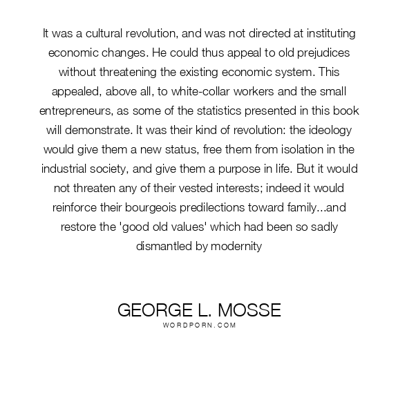 It was a cultural revolution, and was not directed at instituting economic changes. He could thus appeal to old prejudices without threatening the existing economic system. This appealed, above all, to white-collar workers and the small entrepreneurs, as some of the statistics presented in this book will demonstrate. It was their kind of revolution: the ideology would give them a new status, free them from isolation in the industrial society, and give them a purpose in life. But it would not threaten any of their vested interests; indeed it would reinforce their bourgeois predilections toward family...and restore the 'good old values' which had been so sadly dismantled by modernity