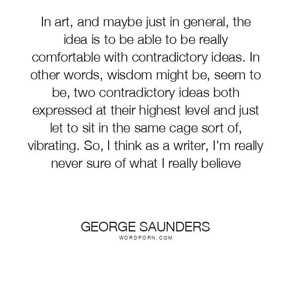 In art, and maybe just in general, the idea is to be able to be really comfortable with contradictory ideas. In other words, wisdom might be, seem to be, two contradictory ideas both expressed at their highest level and just let to sit in the same cage sort of, vibrating. So, I think as a writer, I'm really never sure of what I really believe
