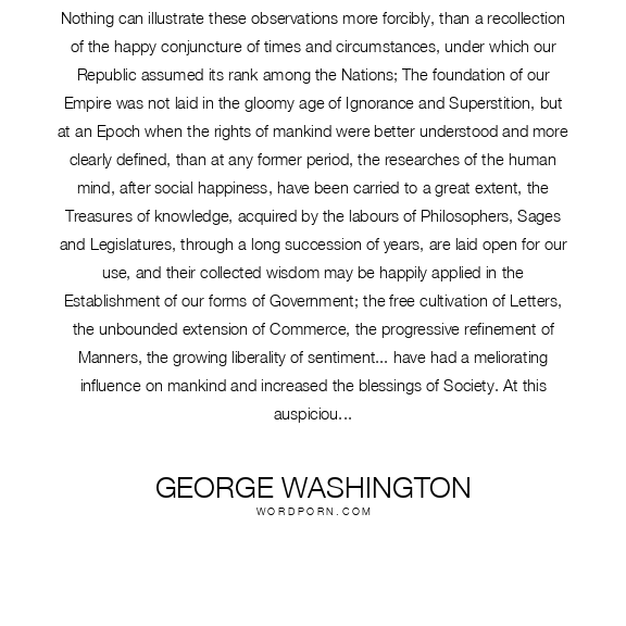 Nothing can illustrate these observations more forcibly, than a recollection of the happy conjuncture of times and circumstances, under which our Republic assumed its rank among the Nations; The foundation of our Empire was not laid in the gloomy age of Ignorance and Superstition, but at an Epoch when the rights of mankind were better understood and more clearly defined, than at any former period, the researches of the human mind, after social happiness, have been carried to a great extent, the Treasures of knowledge, acquired by the labours of Philosophers, Sages and Legislatures, through a long succession of years, are laid open for our use, and their collected wisdom may be happily applied in the Establishment of our forms of Government; the free cultivation of Letters, the unbounded extension of Commerce, the progressive refinement of Manners, the growing liberality of sentiment... have had a meliorating influence on mankind and increased the blessings of Society. At this auspicious period, the United States came into existence as a Nation, and if their Citizens should not be completely free and happy, the fault will be entirely their own.[Circular to the States, 8 June 1783 - Writings 26:484--89]