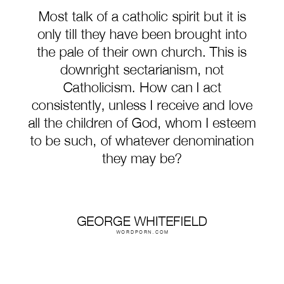 Most talk of a catholic spirit but it is only till they have been brought into the pale of their own church. This is downright sectarianism, not Catholicism. How can I act consistently, unless I receive and love all the children of God, whom I esteem to be such, of whatever denomination they may be?