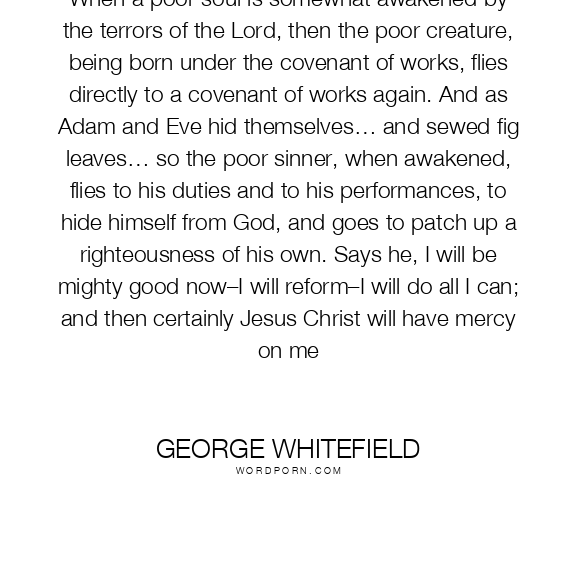 When a poor soul is somewhat awakened by the terrors of the Lord, then the poor creature, being born under the covenant of works, flies directly to a covenant of works again. And as Adam and Eve hid themselves… and sewed fig leaves… so the poor sinner, when awakened, flies to his duties and to his performances, to hide himself from God, and goes to patch up a righteousness of his own. Says he, I will be mighty good now–I will reform–I will do all I can; and then certainly Jesus Christ will have mercy on me