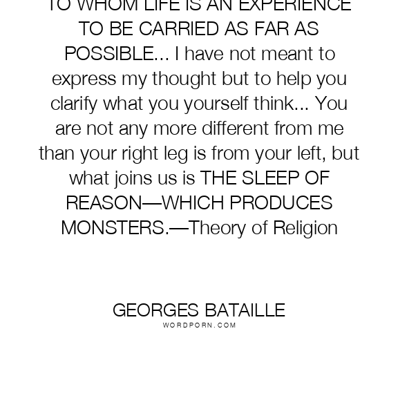 Georges Bataille quote. TO WHOM LIFE IS AN EXPERIENCE TO BE CARRIED AS FAR AS POSSIBLE... I have not meant to express my thought but to help you clarify what you yourself think... You are not any more different from me than your right leg is from your left, but what joins us is THE SLEEP OF REASON—WHICH PRODUCES MONSTERS.—Theory of Religion
