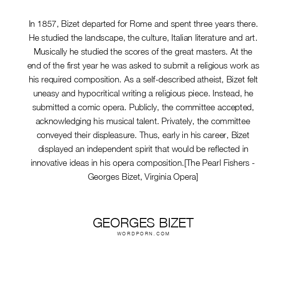 In 1857, Bizet departed for Rome and spent three years there. He studied the landscape, the culture, Italian literature and art. Musically he studied the scores of the great masters. At the end of the first year he was asked to submit a religious work as his required composition. As a self-described atheist, Bizet felt uneasy and hypocritical writing a religious piece. Instead, he submitted a comic opera. Publicly, the committee accepted, acknowledging his musical talent. Privately, the committee conveyed their displeasure. Thus, early in his career, Bizet displayed an independent spirit that would be reflected in innovative ideas in his opera composition.[The Pearl Fishers - Georges Bizet, Virginia Opera]