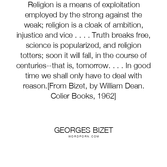 Religion is a means of exploitation employed by the strong against the weak; religion is a cloak of ambition, injustice and vice . . . . Truth breaks free, science is popularized, and religion totters; soon it will fall, in the course of centuries--that is, tomorrow. . . . In good time we shall only have to deal with reason.[From Bizet, by William Dean. Colier Books, 1962]