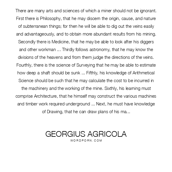 There are many arts and sciences of which a miner should not be ignorant. First there is Philosophy, that he may discern the origin, cause, and nature of subterranean things; for then he will be able to dig out the veins easily and advantageously, and to obtain more abundant results from his mining. Secondly there is Medicine, that he may be able to look after his diggers and other workman ... Thirdly follows astronomy, that he may know the divisions of the heavens and from them judge the directions of the veins. Fourthly, there is the science of Surveying that he may be able to estimate how deep a shaft should be sunk ... Fifthly, his knowledge of Arithmetical Science should be such that he may calculate the cost to be incurred in the machinery and the working of the mine. Sixthly, his learning must comprise Architecture, that he himself may construct the various machines and timber work required underground ... Next, he must have knowledge of Drawing, that he can draw plans of his machinery. Lastly, there is the Law, especially that dealing with metals, that he may claim his own rights, that he may undertake the duty of giving others his opinion on legal matters, that he may not take another man's property and so make trouble for himself, and that he may fulfil his obligations to others according to the law