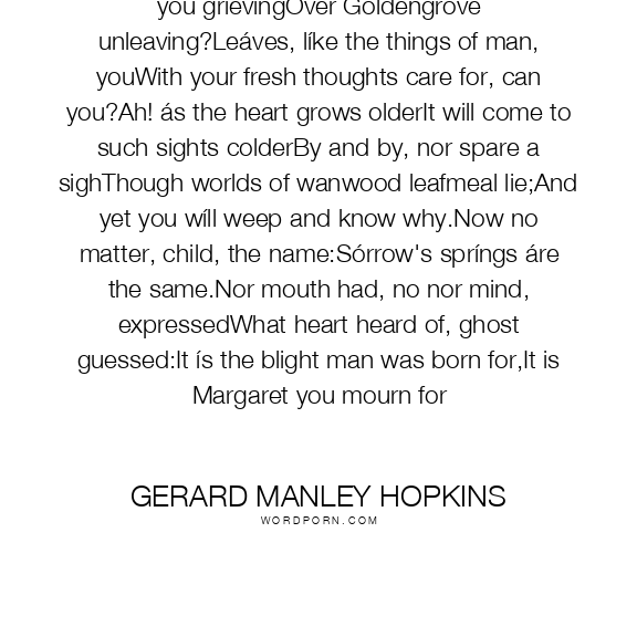 Spring and Fall: To a Young ChildMárgarét, are you gríevingOver Goldengrove unleaving?Leáves, líke the things of man, youWith your fresh thoughts care for, can you?Ah! ás the heart grows olderIt will come to such sights colderBy and by, nor spare a sighThough worlds of wanwood leafmeal lie;And yet you wíll weep and know why.Now no matter, child, the name:Sórrow's spríngs áre the same.Nor mouth had, no nor mind, expressedWhat heart heard of, ghost guessed:It ís the blight man was born for,It is Margaret you mourn for