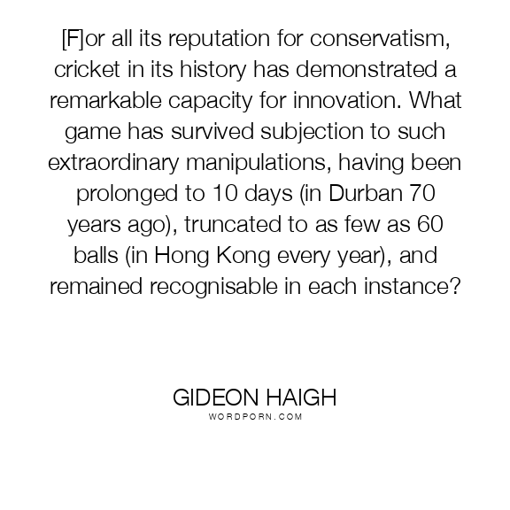 [F]or all its reputation for conservatism, cricket in its history has demonstrated a remarkable capacity for innovation. What game has survived subjection to such extraordinary manipulations, having been prolonged to 10 days (in Durban 70 years ago), truncated to as few as 60 balls (in Hong Kong every year), and remained recognisable in each instance?