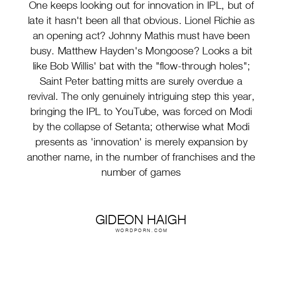 One keeps looking out for innovation in IPL, but of late it hasn't been all that obvious. Lionel Richie as an opening act? Johnny Mathis must have been busy. Matthew Hayden's Mongoose? Looks a bit like Bob Willis' bat with the "flow-through holes"; Saint Peter batting mitts are surely overdue a revival. The only genuinely intriguing step this year, bringing the IPL to YouTube, was forced on Modi by the collapse of Setanta; otherwise what Modi presents as 'innovation' is merely expansion by another name, in the number of franchises and the number of games