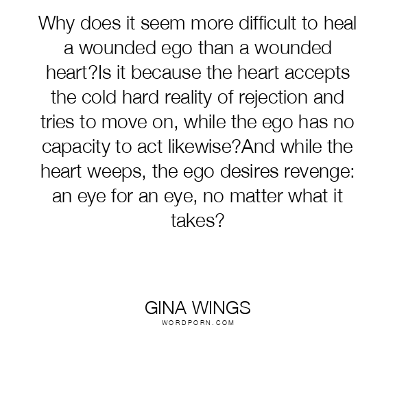 Why does it seem more difficult to heal a wounded ego than a wounded heart?Is it because the heart accepts the cold hard reality of rejection and tries to move on, while the ego has no capacity to act likewise?And while the heart weeps, the ego desires revenge: an eye for an eye, no matter what it takes?