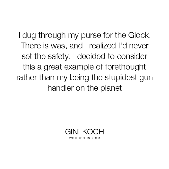 Gini Koch quote. I dug through my purse for the Glock. There is was, and I realized I'd never set the safety. I decided to consider this a great example of forethought rather than my being the stupidest gun handler on the planet