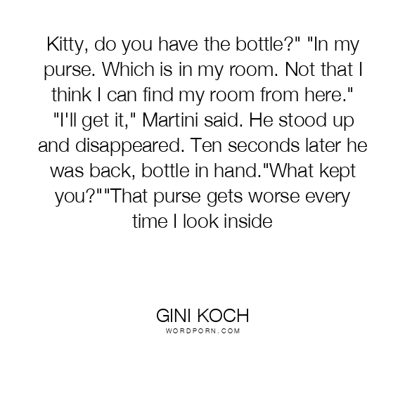 Kitty, do you have the bottle?" "In my purse. Which is in my room. Not that I think I can find my room from here." "I'll get it," Martini said. He stood up and disappeared. Ten seconds later he was back, bottle in hand."What kept you?""That purse gets worse every time I look inside